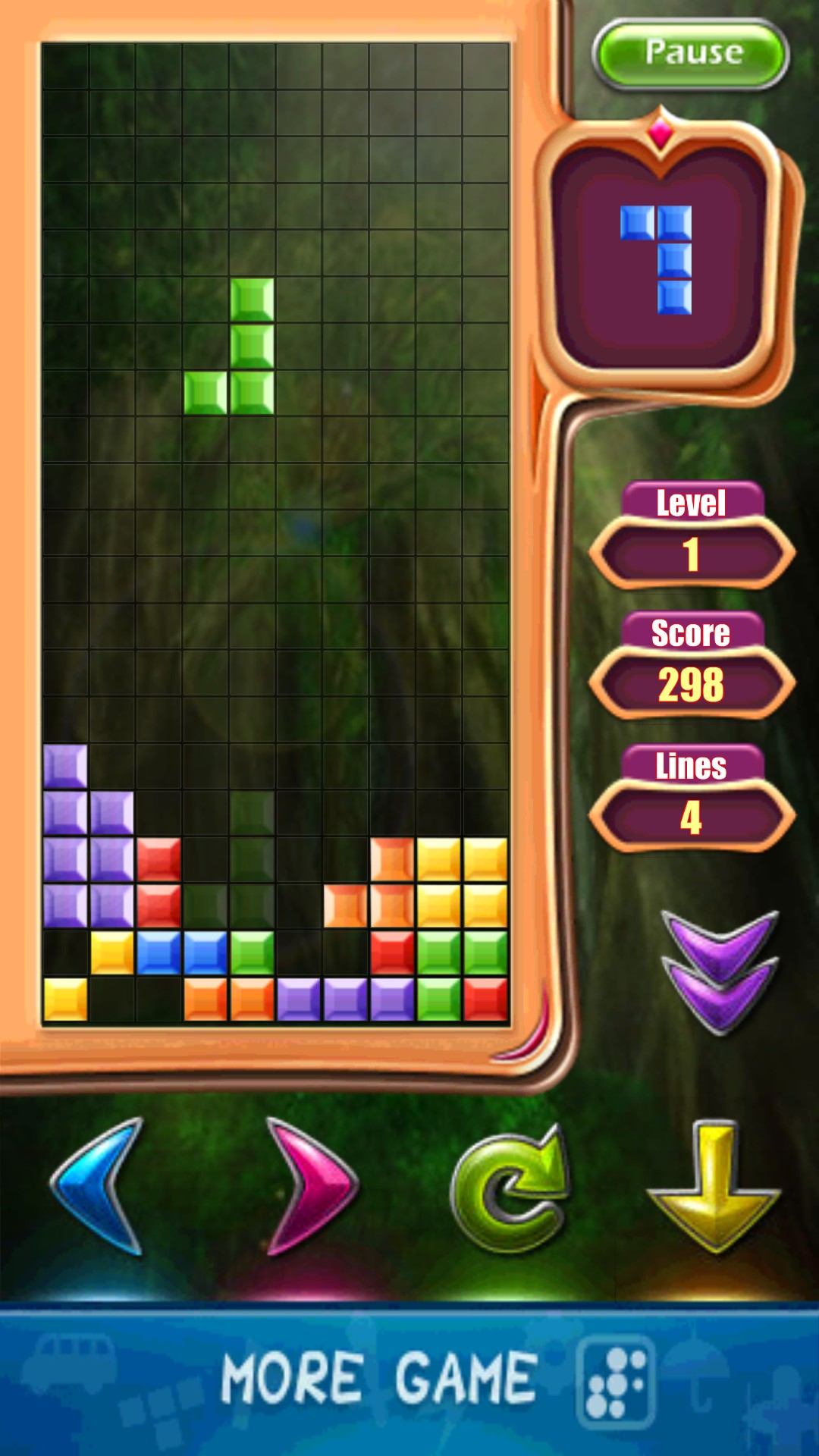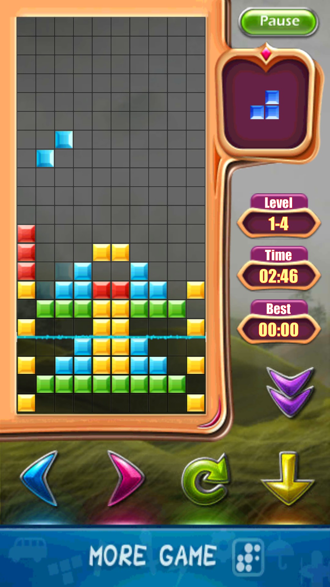 上から次々に落下してくる色々な形をしたブロックを回したり左右に動かしながら、横の列を揃えて消していく簡単なパズルです。