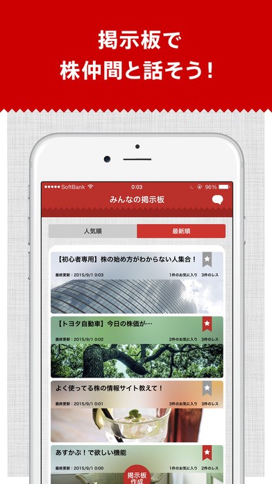 App Store無料ファイナンス部門1位獲得したこのアプリですが、初心者も経験者も集まる、非常に人口が多い株コミュニティーです!