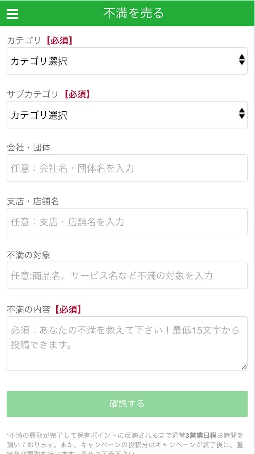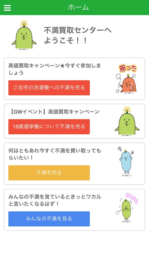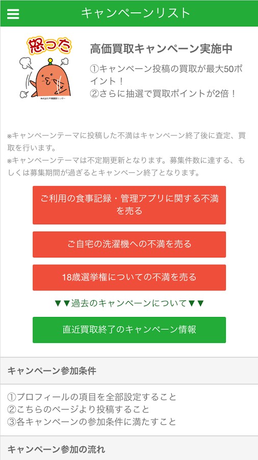 次に、投稿した不満の査定から、買い取り、ポイント、キャンペーンについてご紹介していきたいと思います!まず、不満の査定、買い取りについてですが、通常の不満は一つ(1~10ポイント)で買い取ってくれます。投稿してから、通常営業日程で買い取りを行ってくれ、ポイントを付与してくれる仕組みになっています。また、キャンペーンについてですが、このアプリを活用するからには是非、キャンペーンに参加してポイントを沢山貯める事をおすすめします。このキャンペーンですが、キャンペーンに参加した不満は、一つ(1~50ポイント)で買い取ってくれます。キャンペーンが終わったら、ポイントを付与してくれる仕組みになっています。キャンペーンに参加する事によってポイントを早く貯める事ができるので、是非参加してみてくださいね。また、キャンペーンに参加した不満については、抽選でポイントが2倍になるチャンスもありますし、非公開キャンペーンやイベントも開催していて、参加者にポイントが付与される場合もあるので楽しみながらポイントを貯める事ができるのも魅力的ですよね!