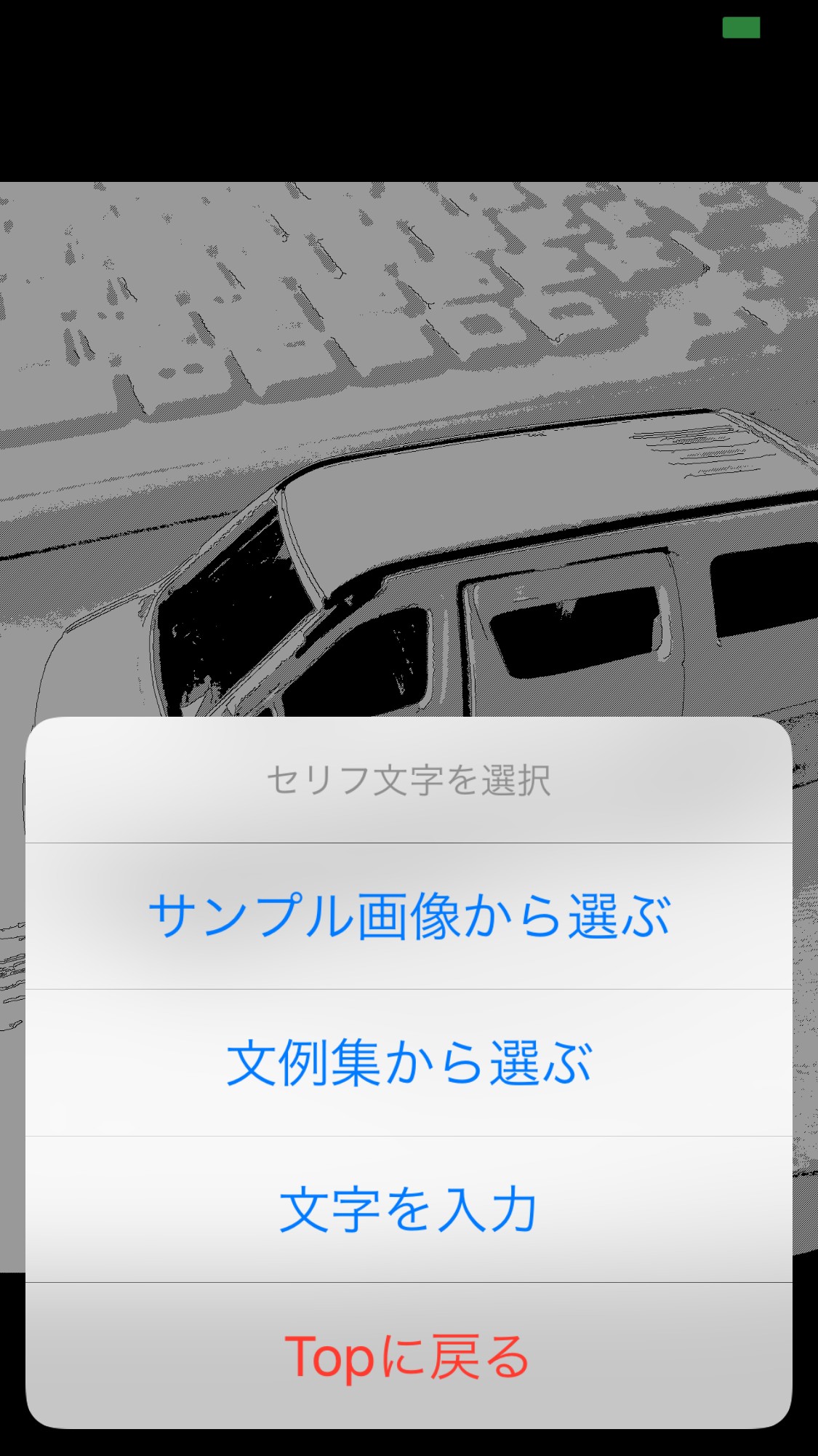 ・画像を選択したら、セリフ文字を選択します。セリフ文字は「サンプル画像から選ぶ」「文例集から選ぶ」「文字を入力」の3つから選べます。