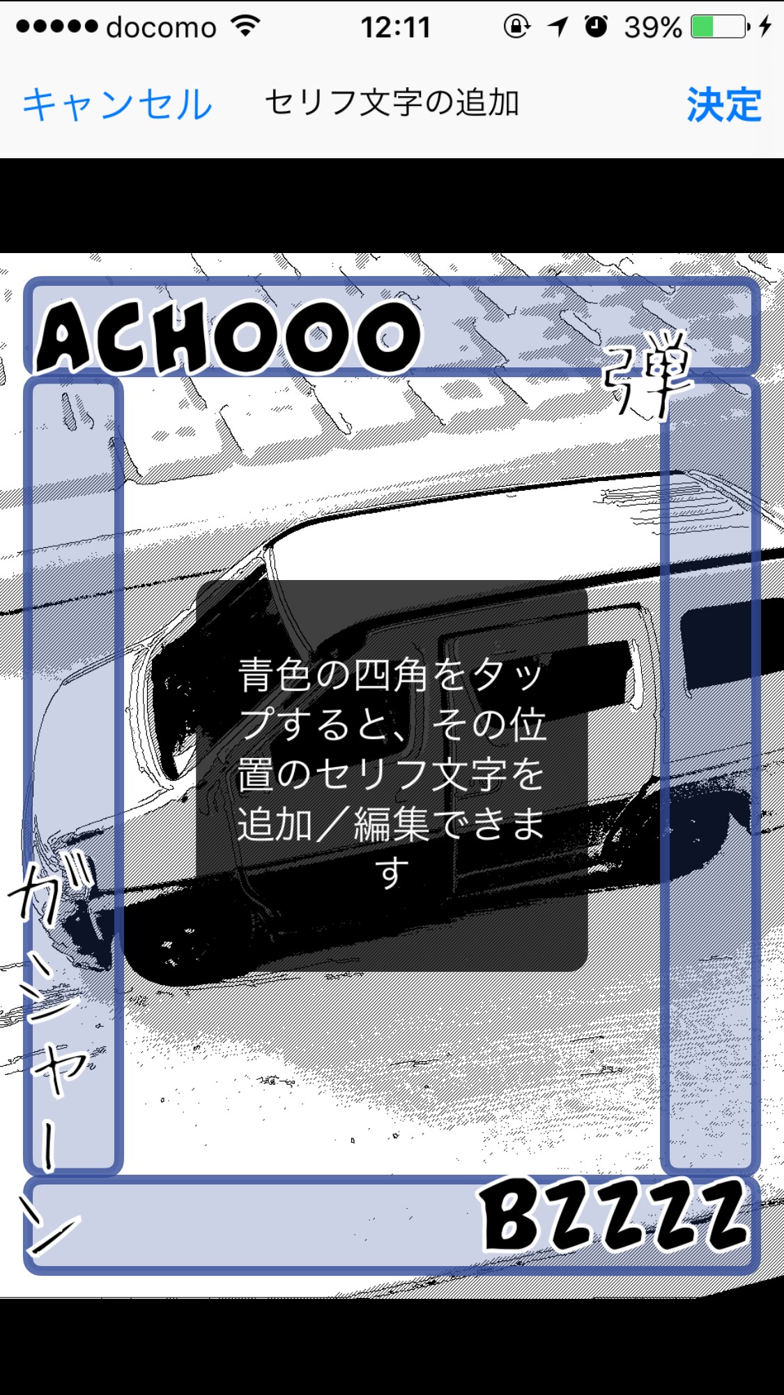 画像は、「漫画ビューで撮影」「カメラで撮影」「写真ライブラリから」の3つから選択します。漫画ビューで撮影では始めからコミックタッチで撮影します。撮りたいものがいきなりコミックタッチで見えるのでちょっとビックリしてしまいます。