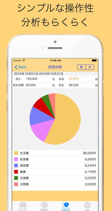 円グラフは、生涯、年、月の3パターンで分析することができて、カテゴリーごとの支出を明確に表示してくれます。