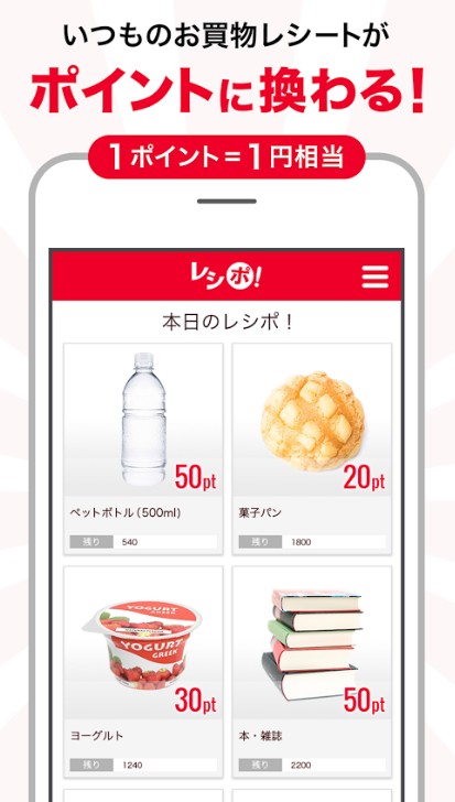 レシートと商品の画像をアプリから応募することで後日ポイントへと変換され、だれでも無料で利用することができます。