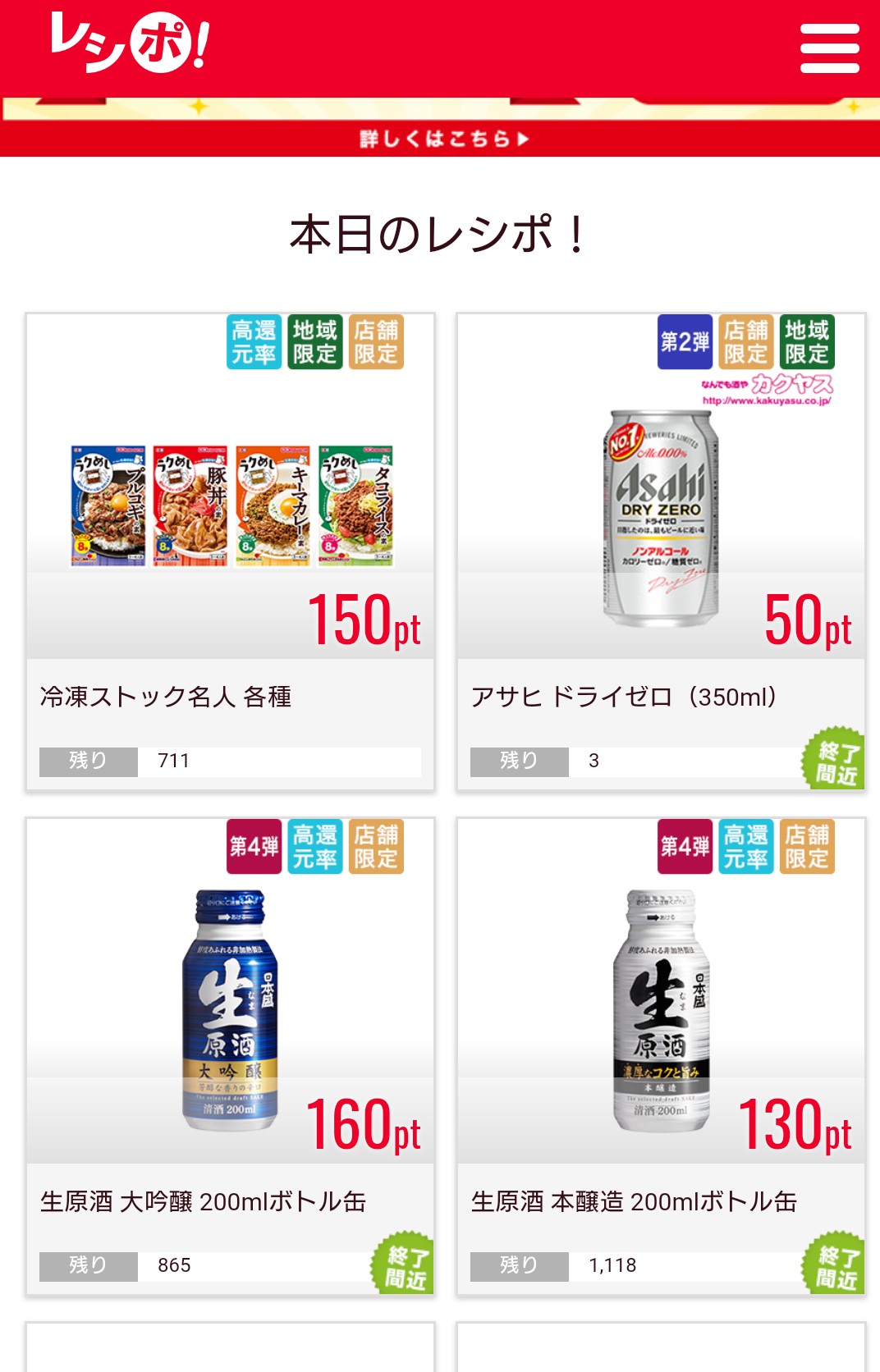 もらえるポイントは「レシポ!」に掲載されている商品毎に異なり、20ポイントのものから、100、200と高いポイントをもらえる商品もあります。