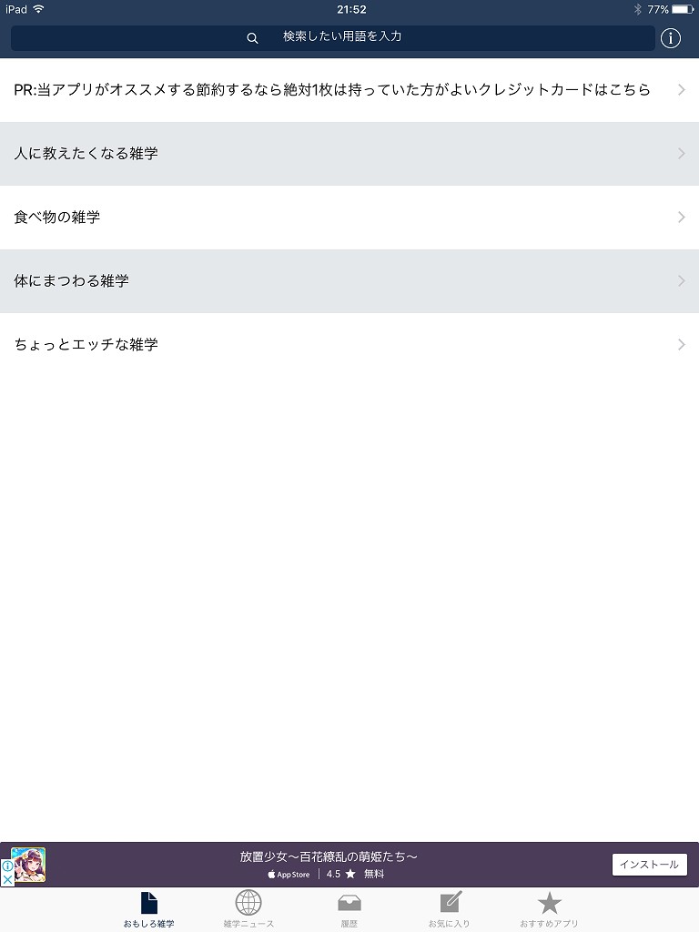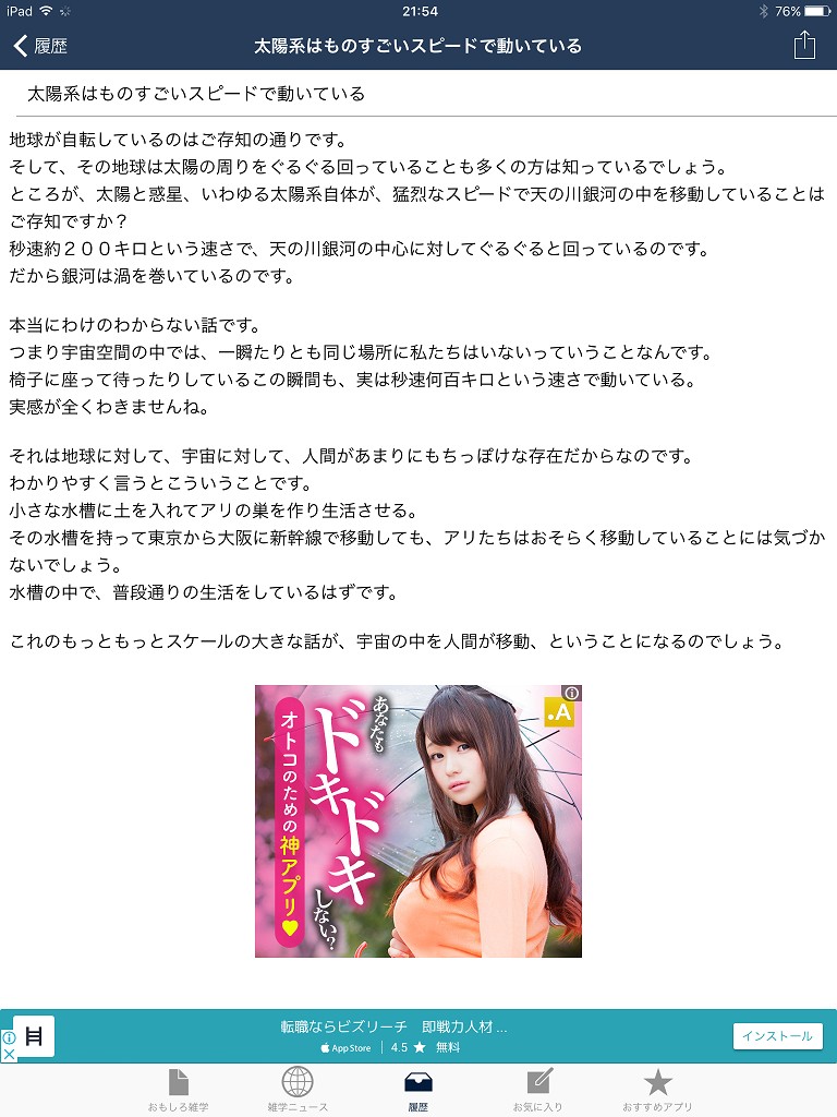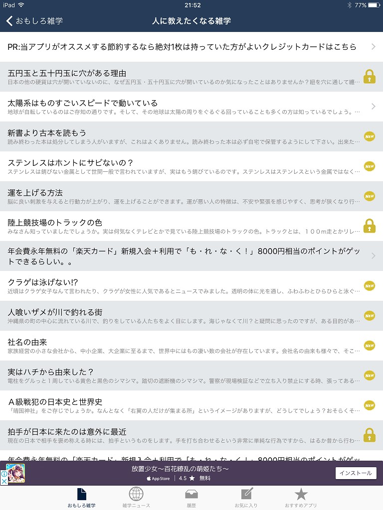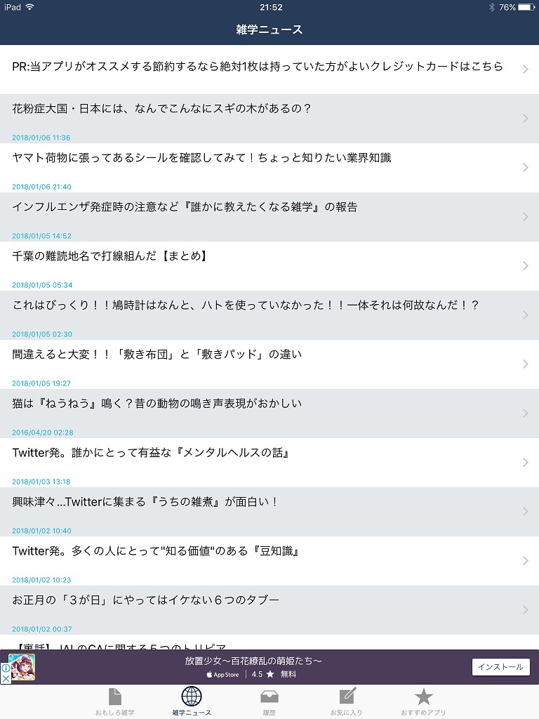 先程も触れましたが「雑学ニュース」カテゴリーではほぼ毎日新たな雑学の記事が掲載されるので、アプリ内の記事を全て読んでしまって読むものがない、といった事態に陥ることがありません。