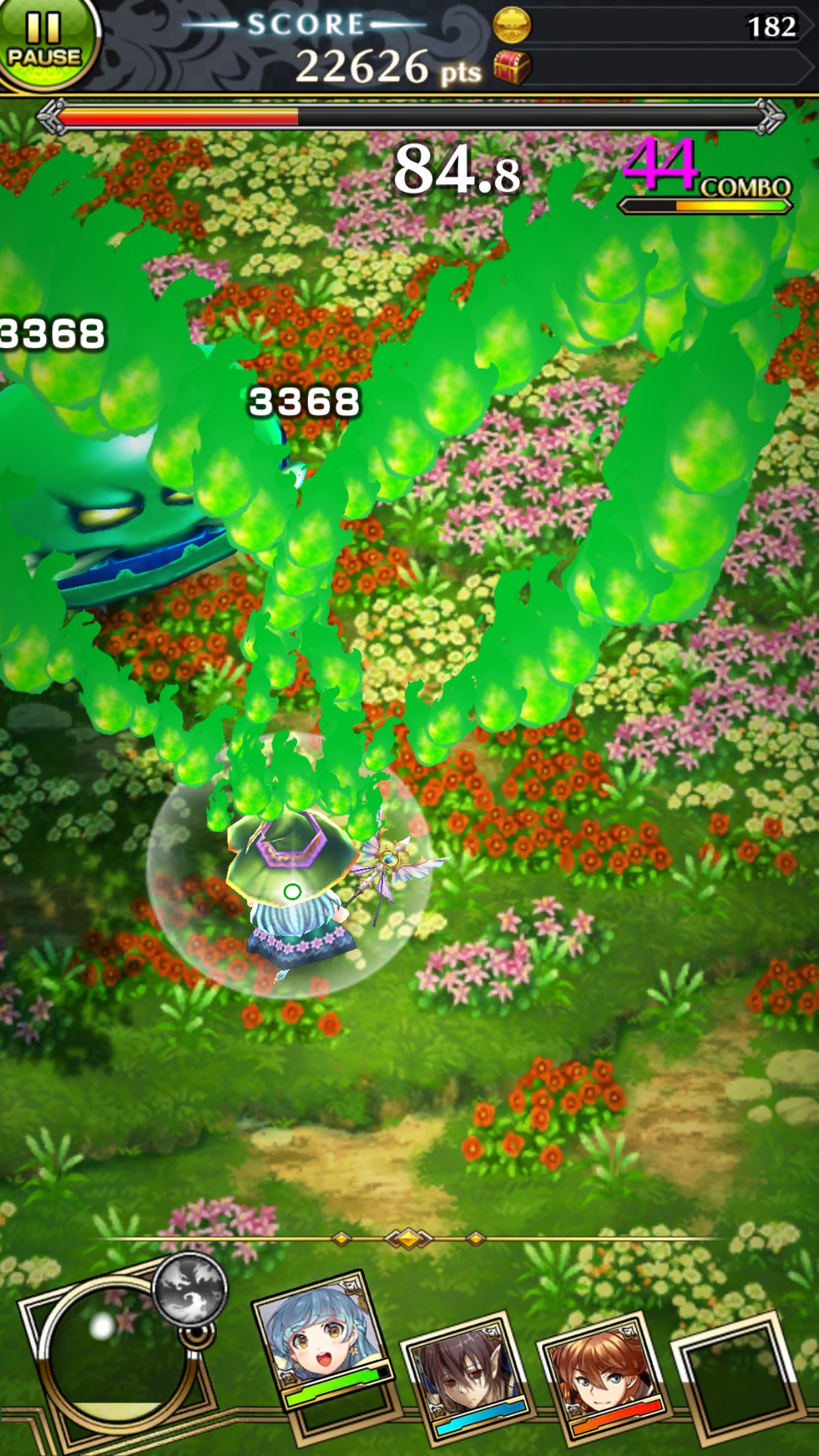 攻撃には、自動的に連続で放たれる「ショット」と中規模なスキル攻撃をする「アクションスキル」、大規模なスキル攻撃をする「ボム」があります。