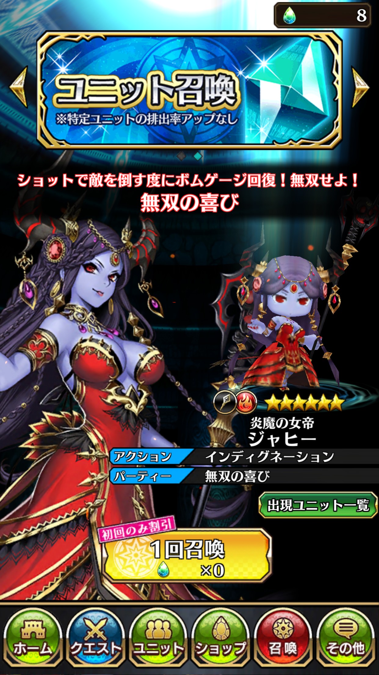 初回は、ユニット召喚の「1回召喚(通常50ジェム)」が無料で1回引きます。