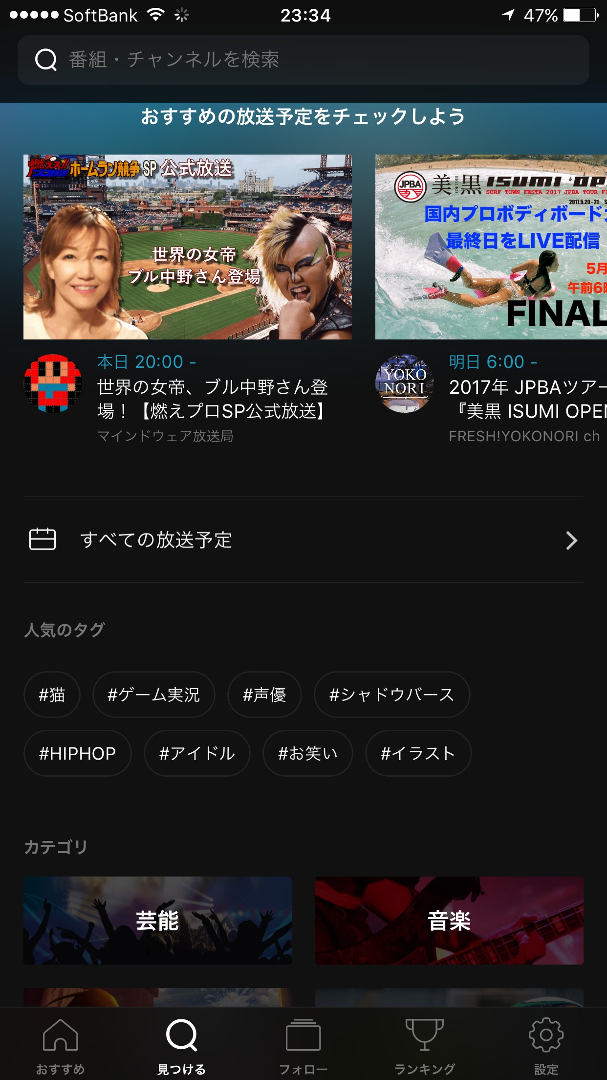 気になるチャンネルをフォローしておけば、放送開始時に通知が届きます。