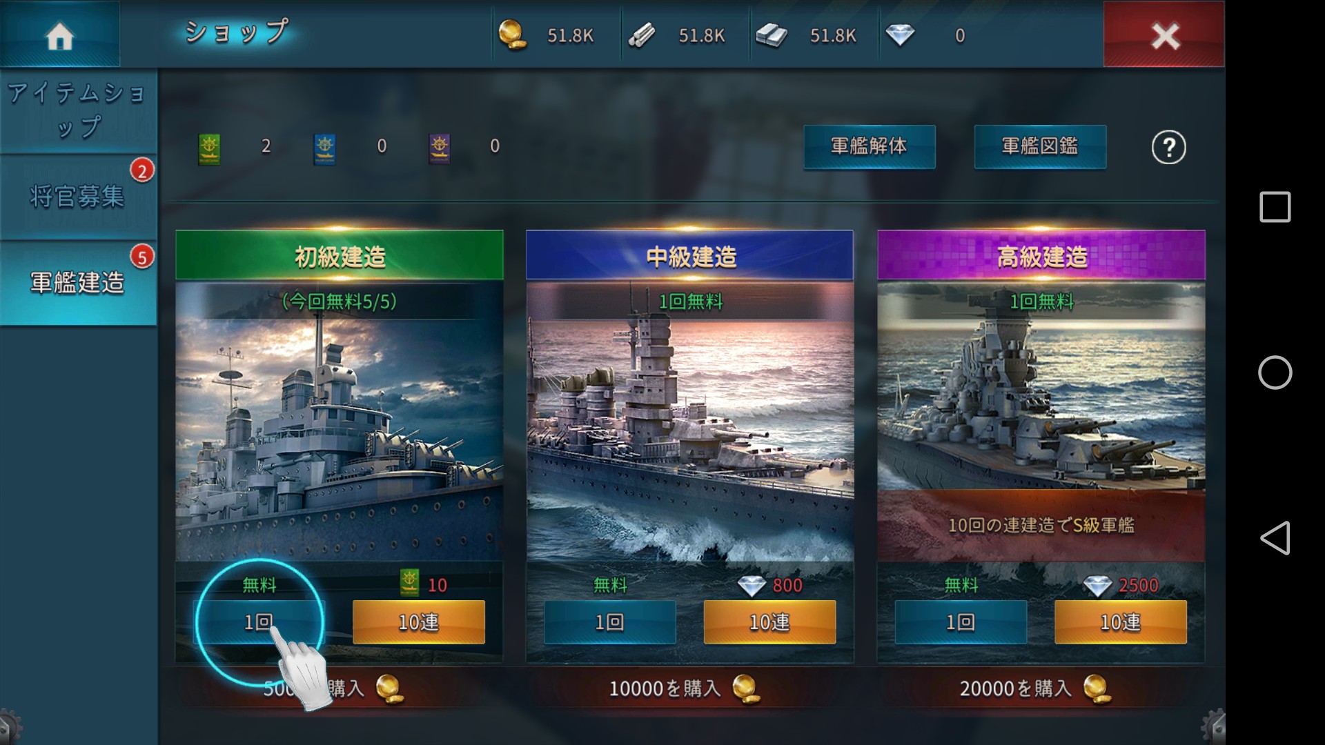 最初の戦闘が終わると、新たな軍艦を建造するためのガチャを無料で1度引かせてもらえます。
