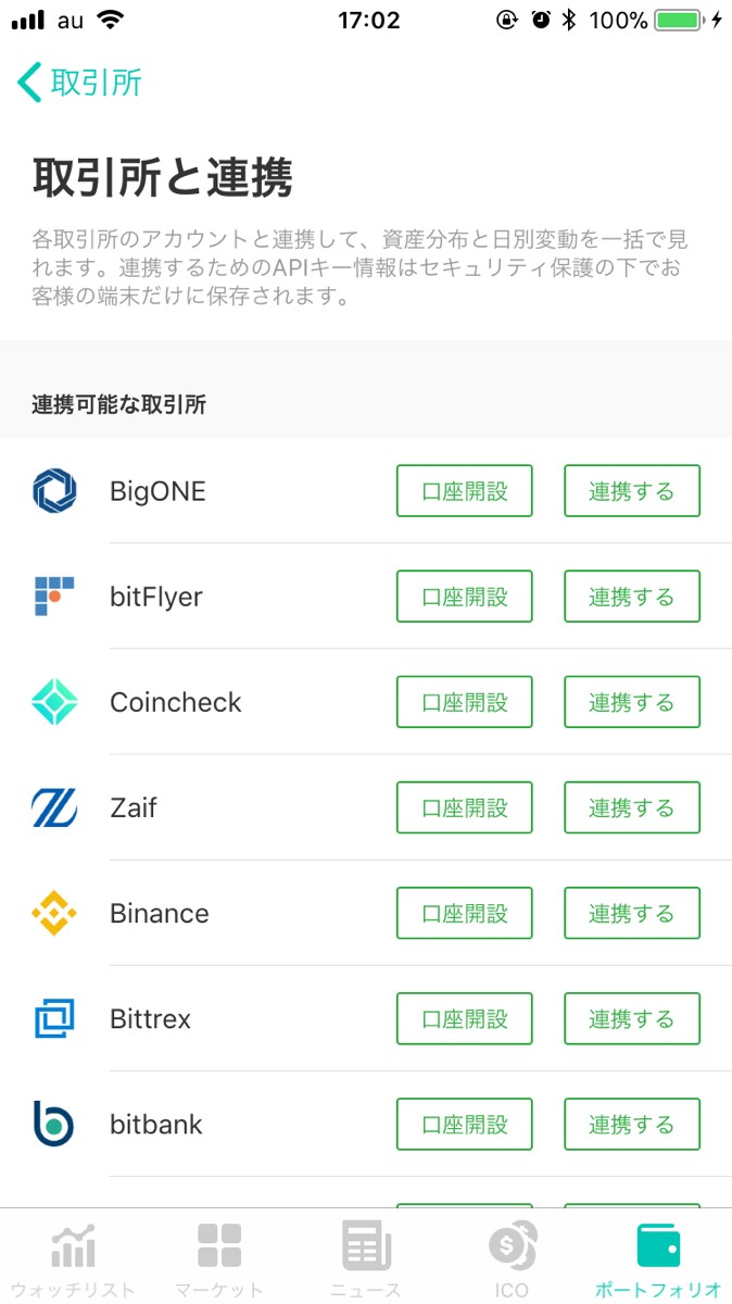 取引機能と情報チェック機能がひとつのアプリで一元化されていることにより、最新の情報を取り入れた効率的で迅速な取引が可能になります。さらに、このアプリの取引機能の特徴として挙げられるのが、複数の取引所と連携しているところ。