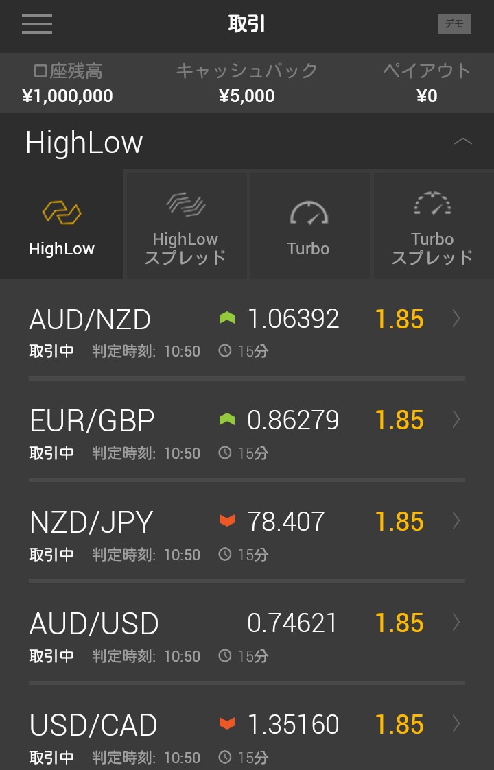 本アプリでは、「high/low」「high/lowスプレッド」「turbo」「turboスプレッド」の4つの取引ができますが、なかでもturboスプレッドはペイアウト倍率が2倍固定の高倍率となっています。