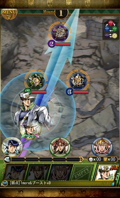 例えば、上の画像ですと、選んでいるユニットメダルのジーザ―は「青の属性」なので、「緑の属性」の敵メダルに打ち込むと弱点となり、大ダメージを与えることが出来ます。「属性」の相性を使いながら、バトルを有利に進めていきましょう!