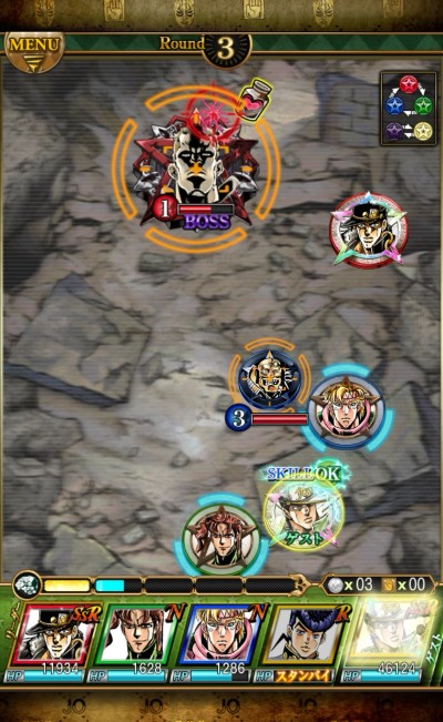 このゲームアプリでは、『ジョジョの奇妙な冒険』のキャラクターたちの必殺技を多彩に表現した「スキル」を使うことができます。「スキル」を使うと敵に代ダメージを与えることが出来たり、能力を上げたり、下げたり、とバトルで有利になることばかりです!「スキル」を使ってバトルを有利に進めて、勝利していきましょう!