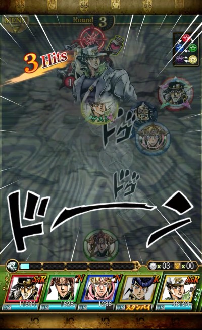 敵のメダルにぶつけると、「スキル」が発動し、モーションが流れます。『ジョジョの奇妙な冒険』ではおなじみの必殺技ですね!かっこいい!