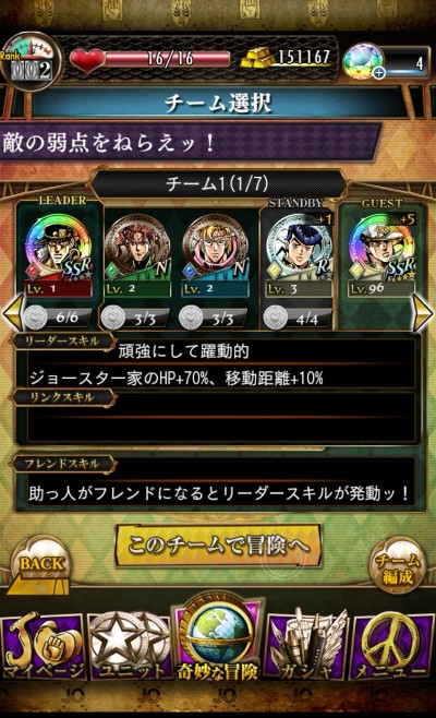 このゲームアプリでは、4つの手持ちメダルとゲストのメダルを選んで、「クエスト」の冒険をすることができます。「クエスト」では、「ジョジョの奇妙な冒険」で登場した場所やストーリーが再現されています!「ジョジョの奇妙な冒険」の冒険を「クエスト」で体験することができるんです!