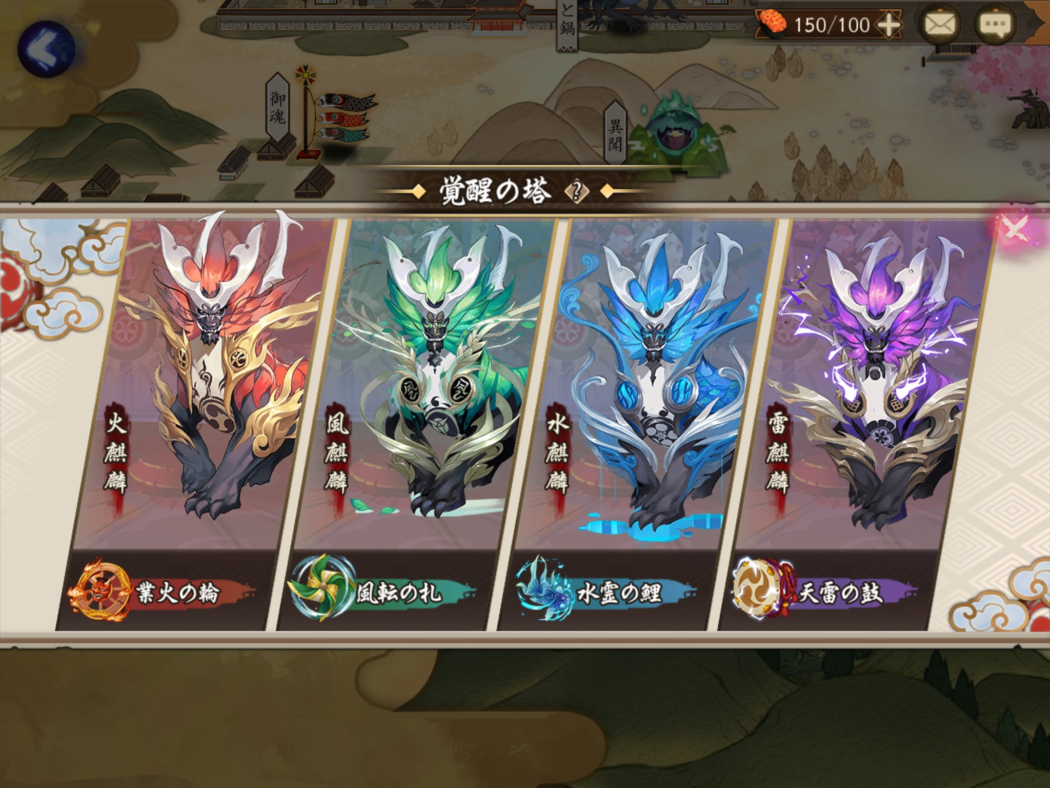 赤い麒麟は炎属性の業火の輪、緑の麒麟は風属性の風転の札、青い麒麟は水属性の水霊の鯉、紫の麒麟は雷属性の天雷の鼓を手に入れることができます。業火の輪、風転の札、水霊の鯉、天雷の鼓にはランクもあり、妖怪によってどのアイテムのどのランクのものがどれだけ必要かが異なります。