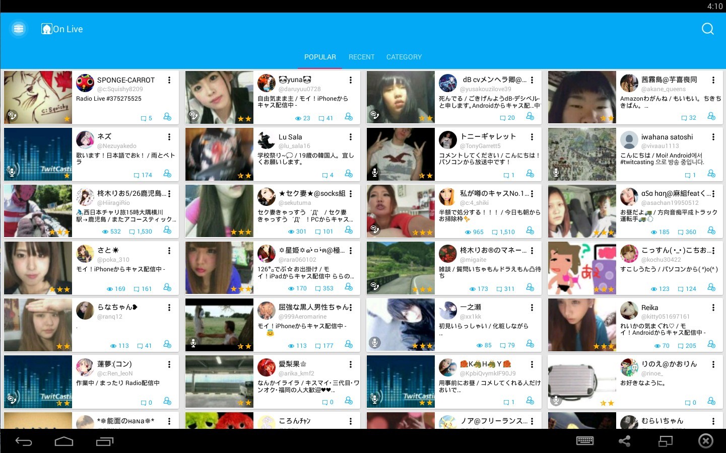 「ツイキャス・ビュワー」を起動すると、まずこのスクリーンショットのように現在配信中のチャンネルが一覧で表示されます。これは「配信動画を見たいけど何を見たいかは決めていない」場合や「隙間時間ができたから何かいい動画はないかな?」といった場合に有用です。現在配信中のチャンネルが一目で分かるのでそこから見たい動画へ飛ぶことができます。気になった動画にすぐに飛ぶことができるので、ストレスなく動画を見ることができるでしょう。