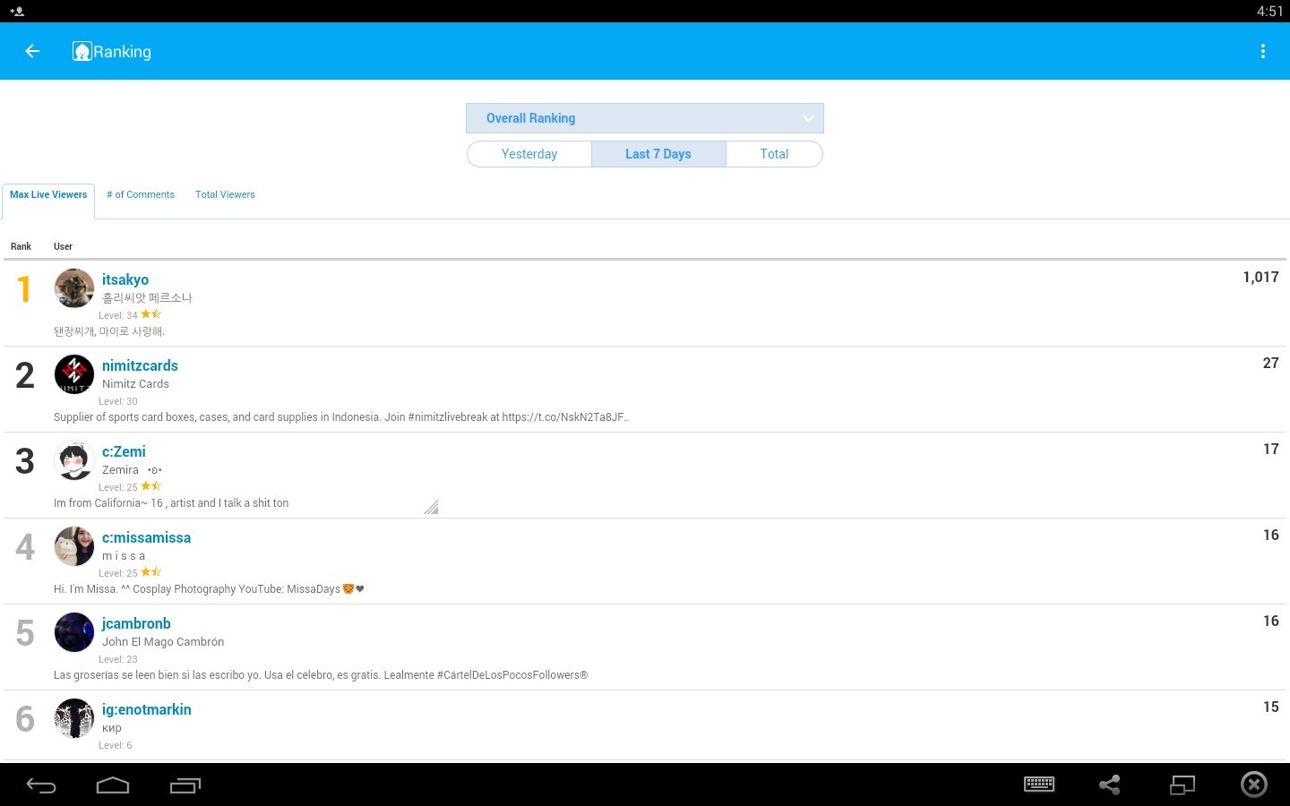 「ツイキャス・ビュワー」ではツイキャスのランキングを見ることもできます。過去1週間の合計視聴数ランキングや昨日の視聴数ランキングなどを見ることができるので、ここを見ておけば一目で人気配信チャンネルが分かるでしょう。「人気チャンネルではどんな配信をやっているのだろう?」と気になった際はぜひこのランキングからチャンネルへ飛んで視聴してみることをおすすめします。