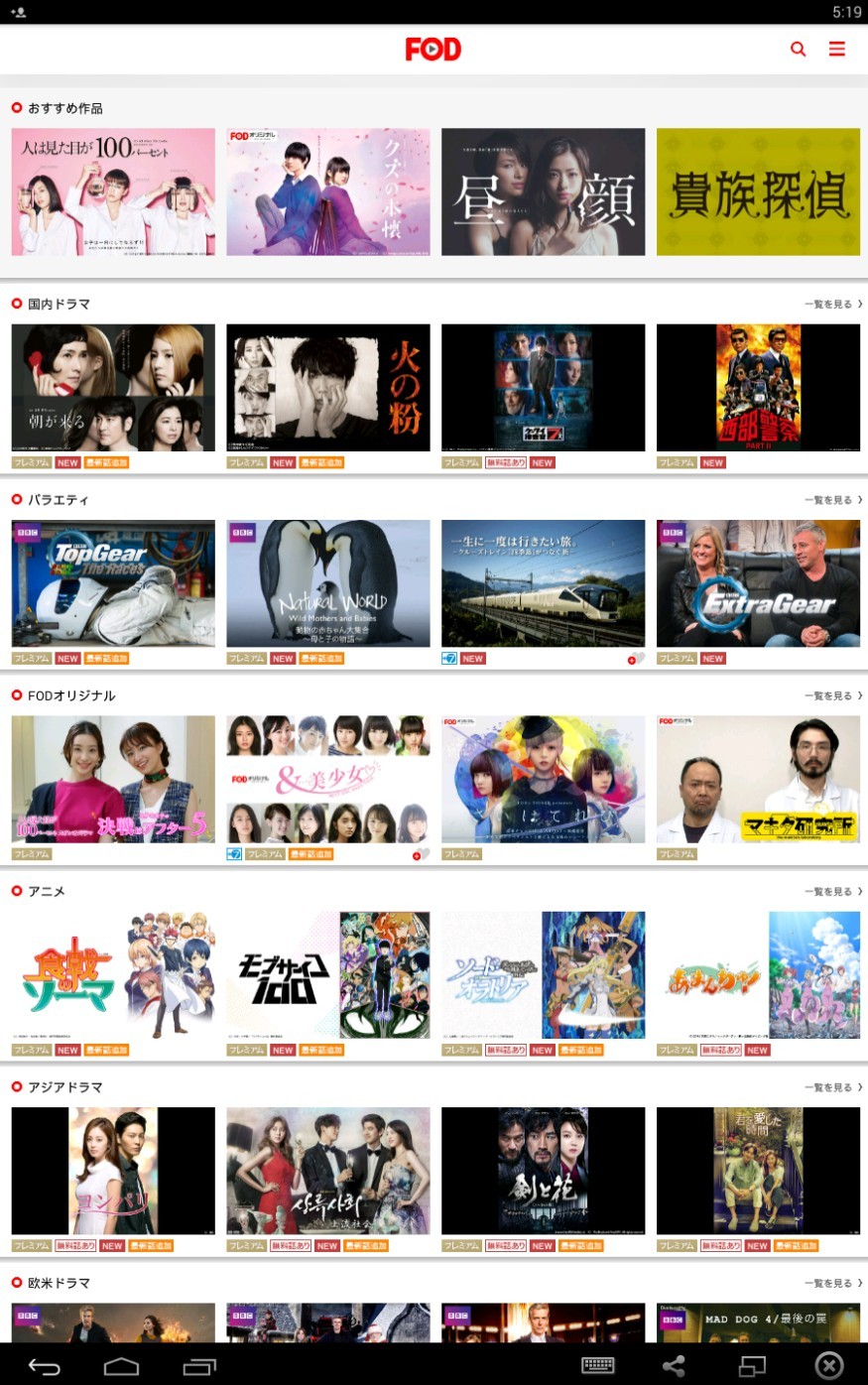 アプリをダウンロードして起動すると、「FOD」が配信する動画がカテゴリー別一覧で表示されます。新着動画や無料視聴が可能な動画にはわかりやすいアイコンがついているので、迷うことなく見ることができるでしょう。