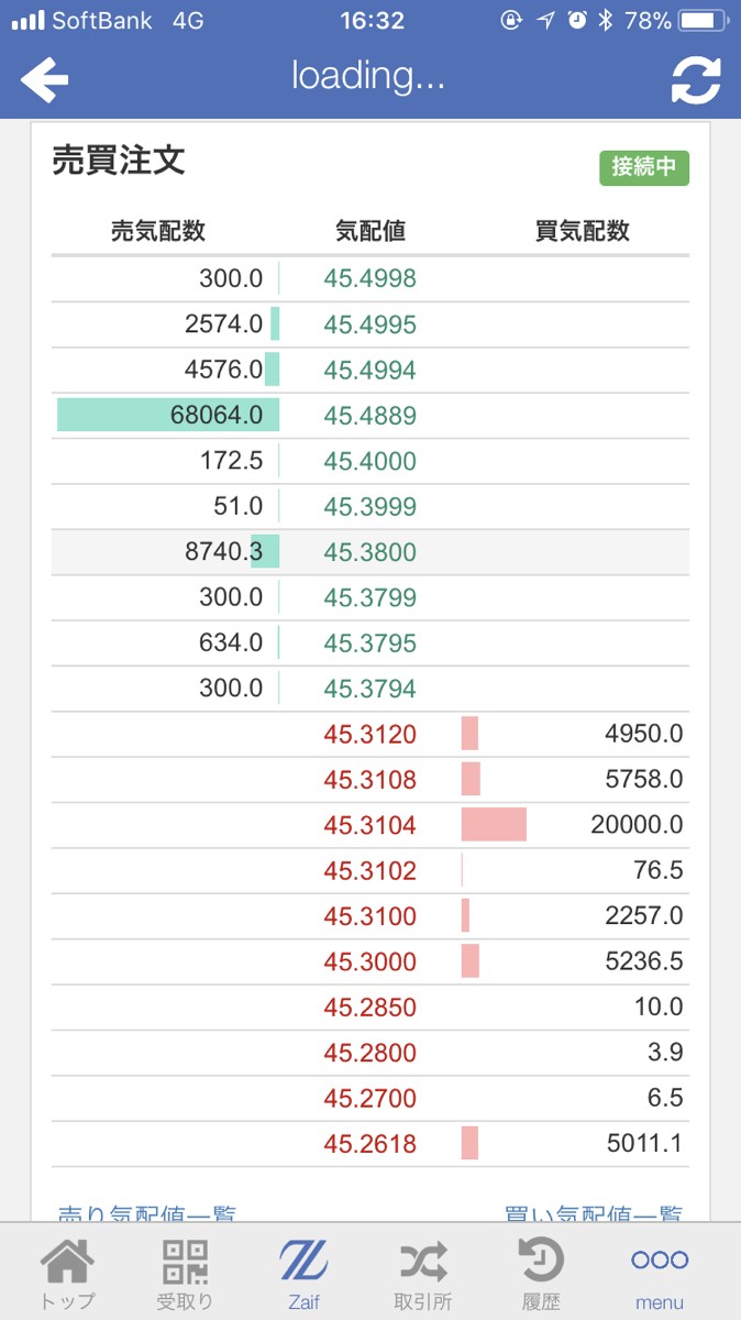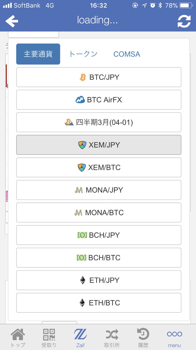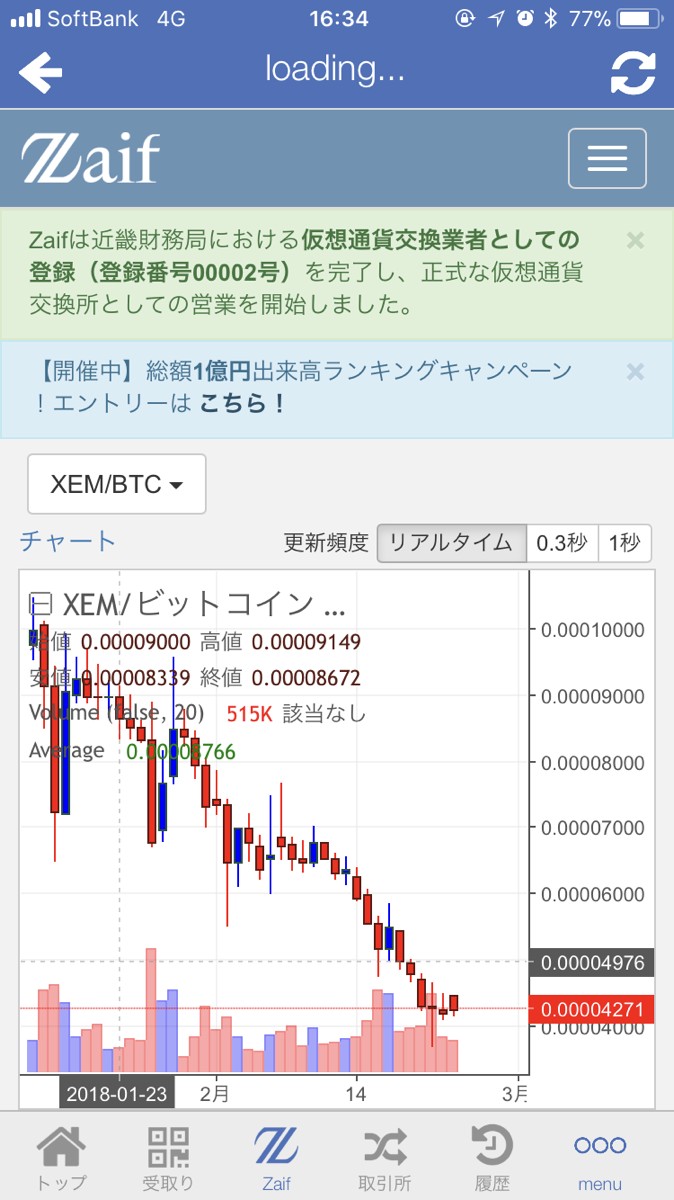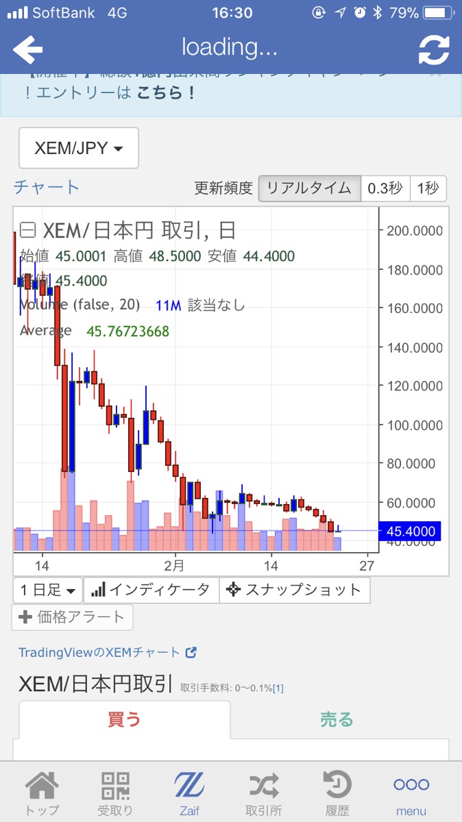 パソコン版の「Zaif」と同じように、チャートを見ることができます。わざわざパソコンを立ち上げなくても、スクロールでxemを選ぶとリアルタイムで手軽にチェックできます。