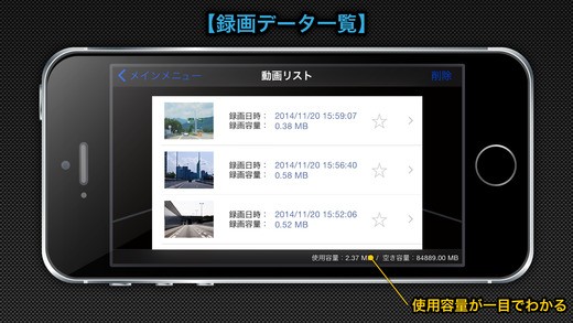 無駄なバッテリー低下を防ぐため、「マルチドライブレコーダ」はしばらく操作をしないでいると自動で画面をオフにしてくれます。録画動画の使用量もデータの一覧で簡単にわかるので、不要なファイルを削除して空きを作ることが可能です。運転中でもスマホを気にしないでいられる工夫に満ちているので、ドライバーの集中を邪魔することはありません。