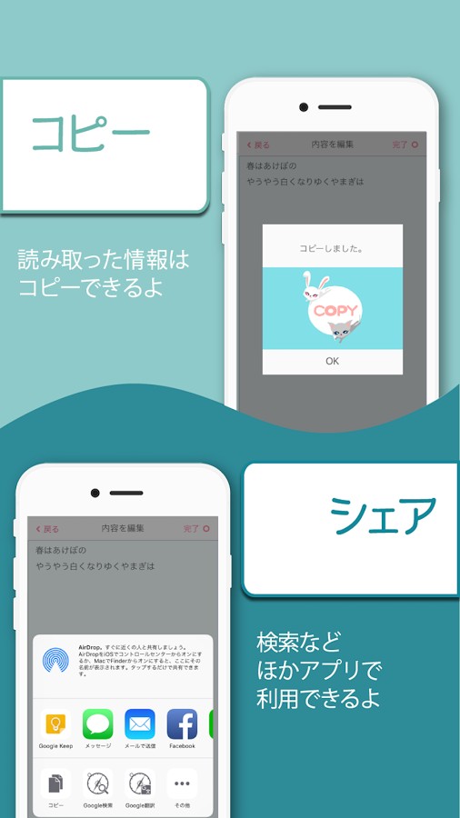 このアプリの魅力は、メッセージ・メール・Twitterなど、様々なSNSをはじめ、携帯で利用している他のアプリに、このアプリで読み取った文字を共有できるところが挙げられます。読み取りが完了し、画面が切り替わり読み取った文字だけ表示されたら、画面の右上にある【共有】アイコンをタップすると、様々なSNSなどで共有可能になります。とても簡単に共有する事ができるのも魅力的ですよね。アプリを使った際には、是非利用してみてください!