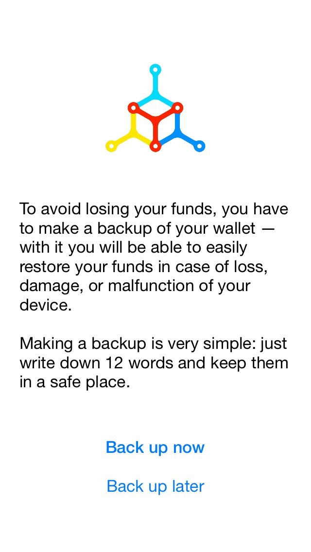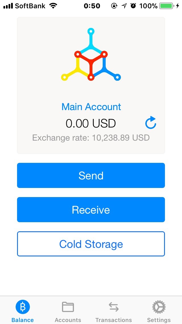 Myceliumは、iOS版アプリでは日本語に対応していません(2018年2月現在)。また取り扱い通貨もビットコインのみではありますが、オリジナル機能として「コールドストレージ」を採用しています。これはオフライン環境でウォレット管理ができる機能で、ハッキングによる保有通貨の悪用を防ぐ役割を果たします。使用手順は少なく簡単です。あらかじめ保管したい通貨のQRコードをペーパーなどで用意しておき、アプリを開くと表示されるコールドストレージのボタンを押して読み取ります。すると、このQRコードそのものがプライベートキーとなり、アクセス可能になるという仕組みです。オフラインであることから、端末が紛失しウォレットが復元不可能となる事態に備え、バックアップをとっておくこともできます。メイン画面の「Back up now」というボタンを押すと順に出てくる12個の単語を紙などにメモするだけです。メモは、人目の付かない場所に保管しておくと良いでしょう。