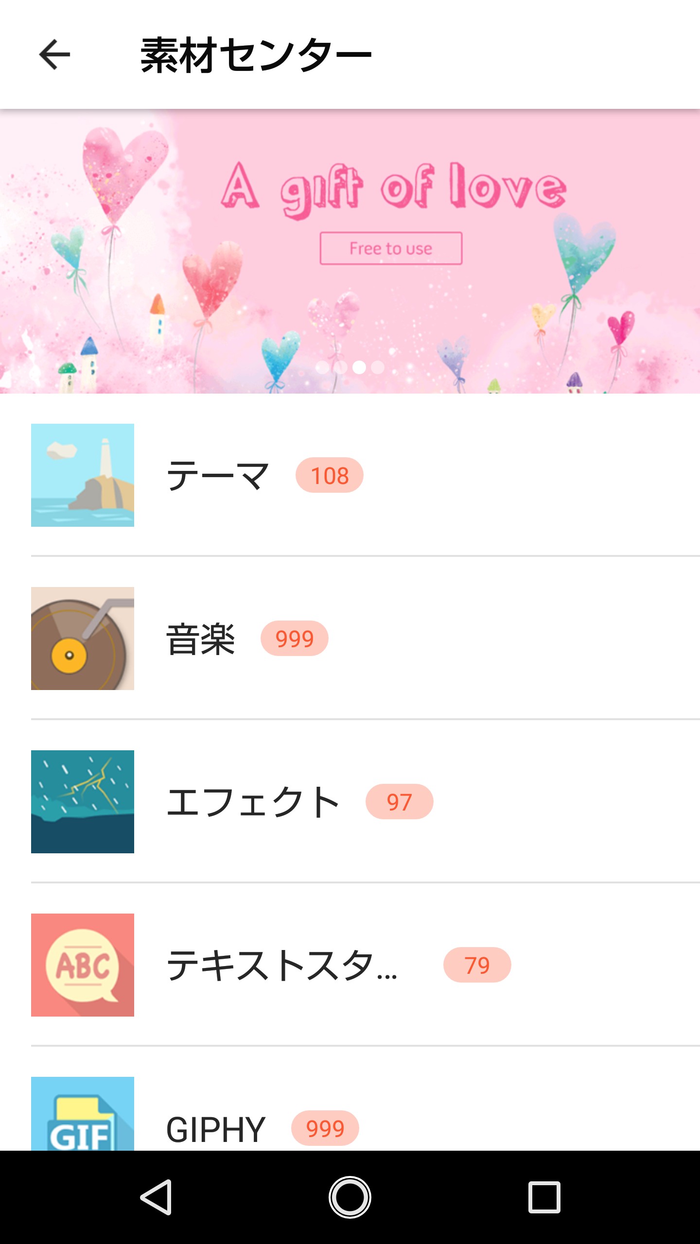 トップ画面から「エフェクト」を選択すると、テーマや音楽に音響効果などたくさんの素材をダウンロードして使うことができます。