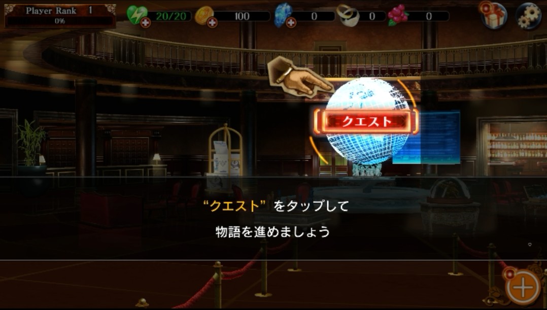 ここでストーリーは終わり、自動的にホーム画面へと移動します。「クエスト」を始めるようです。さっそく「クエスト」をタップしてみます。