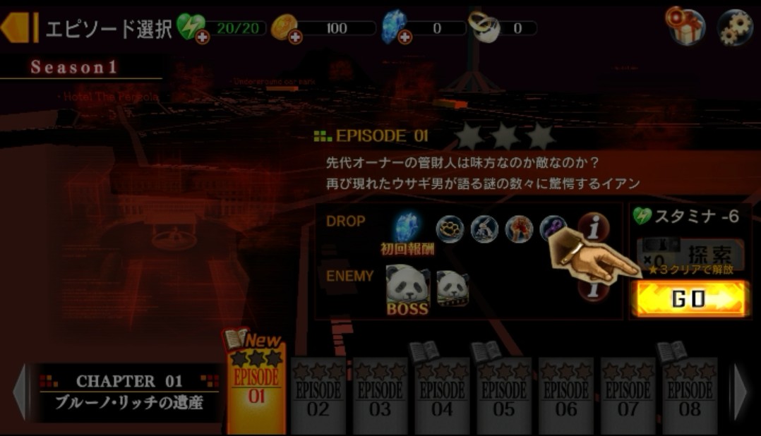 「エピソード選択」の画面に切り替わりました。ここでは指示通り「Chapter01」を進めるため「GO」をタップします。