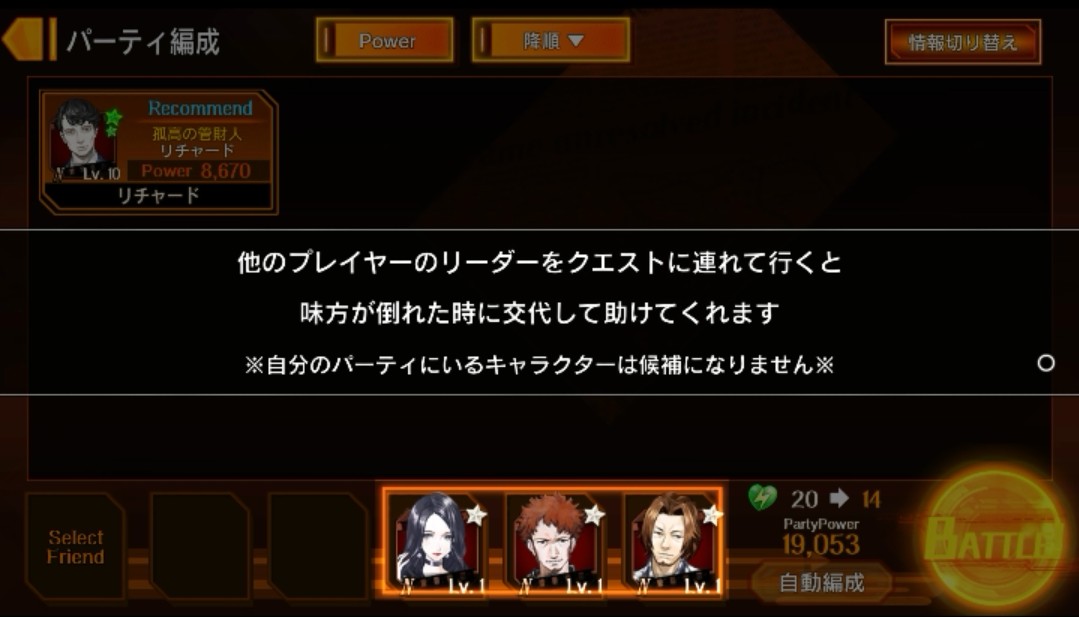 先ほど「自動編成」で選んだ3人のキャラクターカードの他に、他のプレイヤーのキャラクターカードを1人、クエストに連れていけるようです。クエスト中にパーティの誰かが倒れたときは、フレンドのキャラクターが交代してくれる、と。便利ですね!これはぜひともフレンドキャラクターを連れていかなけれいけませんね!