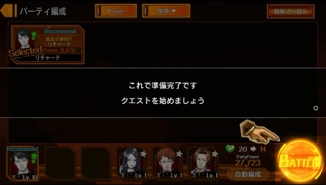 準備が整ったら「BATTLE」をタップしてクエストを始めます。