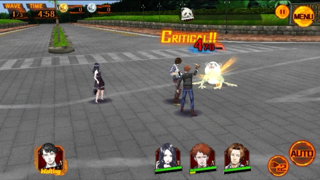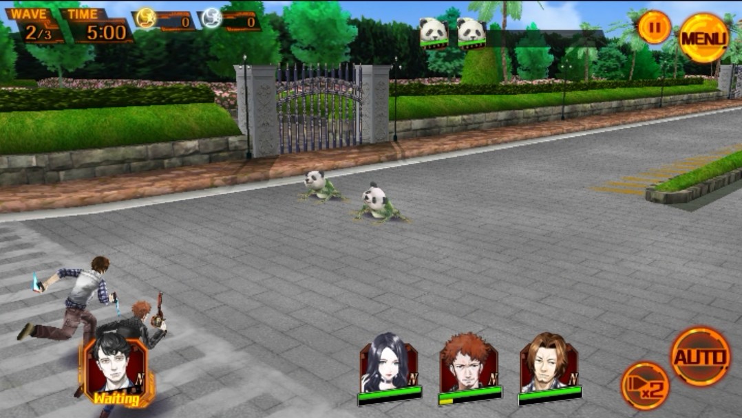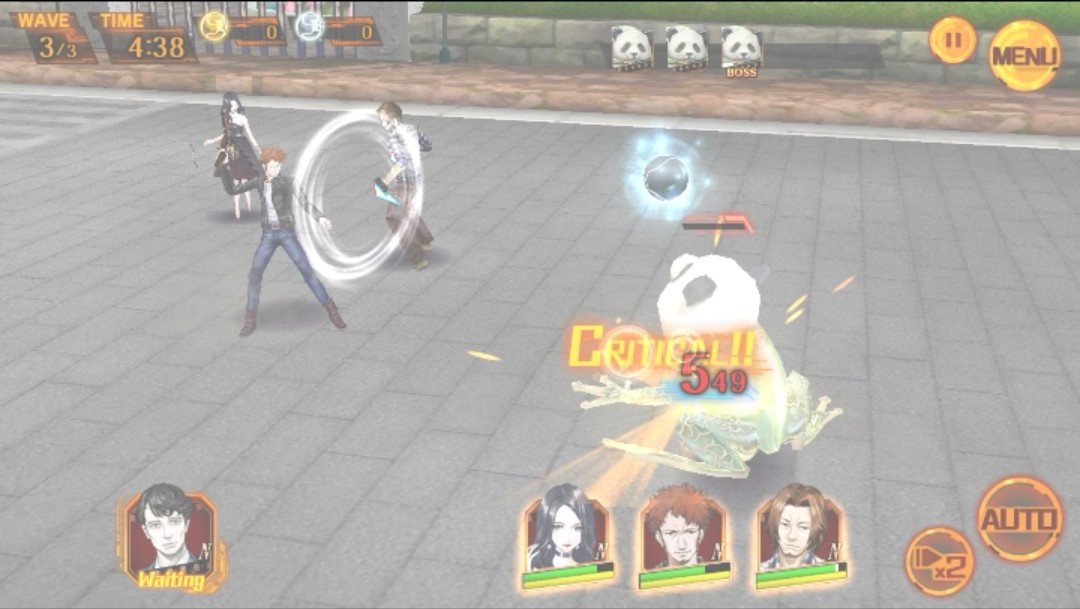 次はバトル画面へと切り替わりました。キャラクターたちが自動でキメラたちの前まで走り、バトルが開始されます。どうやら攻撃はキャラクターたちが自動で攻撃をしてくれるようで、「エナジーゲージ」が溜まったら、下部分のキャラクターの顔アイコンをタップして「パラノーマル(必殺技)」を発動させる、というバトルシステムのようです。最初のバトルで説明がありましたね!「エナジーゲージ」が溜まるまでキャラクターたちに操作はお任せできるので、面倒な操作などが一切なくてとても楽ですねsで!また、「×2」をタップすると2倍速に、さらにタップすると「×3」3倍速に早送りされ、「エナジーゲージ」が溜まるまでの時間が早くなります。早く次のストーリーを読みたいときや、時間を短縮したいときなど、とても便利ですね!また、「AUTO」をタップすると、キャラクターの顔アイコンをタップしなくても自動で「パラノーマル」を発動させて、キメラを攻撃してくれます。便利な機能がたくさんあって嬉しいです!
