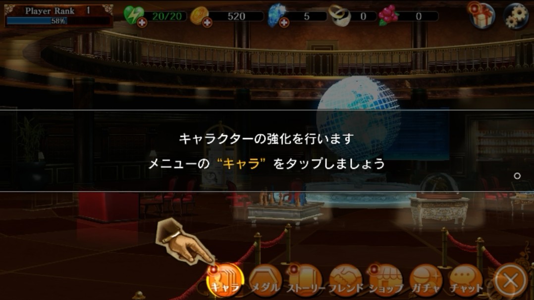 キャラクターの強化を教えてくれるようです。メニューのキャラをタップします。