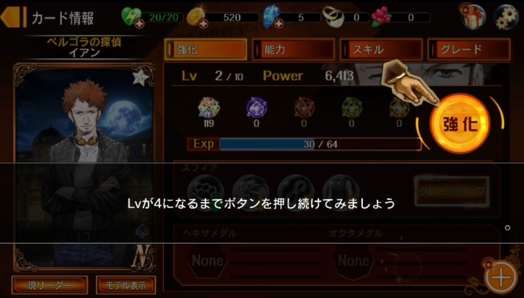 キャラクターカードに経験値を与えてレベルアップすることで、パラメーターが上昇するようです。さっそく「強化」をタップして、キャラクターカードに経験値を与えてみます!