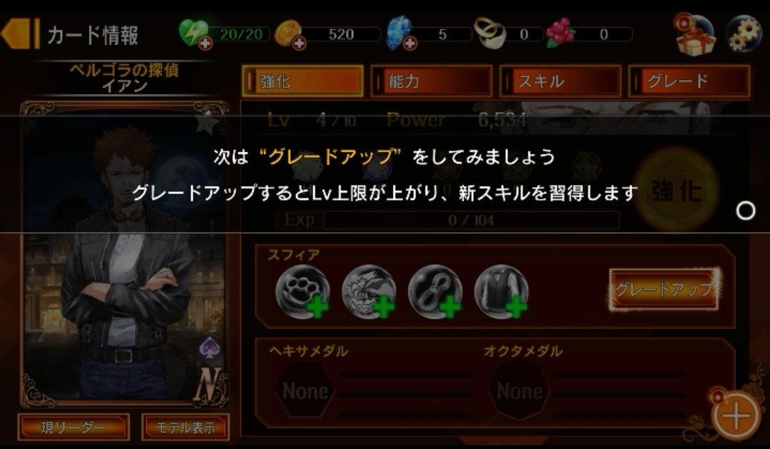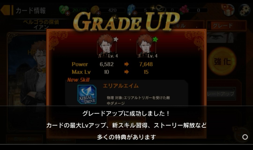 グレードアップをすると、「カードの最大レベルアップ」「新スキル取得」「キャラクターストーリー開放」など、さまざまな特典があるようです!流れ的には、クエストをクリア→指定されたスフィアを集める→グレードアップ、という流れになりそうです。グレードアップしないとキャラクターの最大レベルが上がらない、キャラクターカードが強くならない、ということですので、グレードアップはこのゲームアプリを進めていく上で重要なゲーム要素になりそうです!