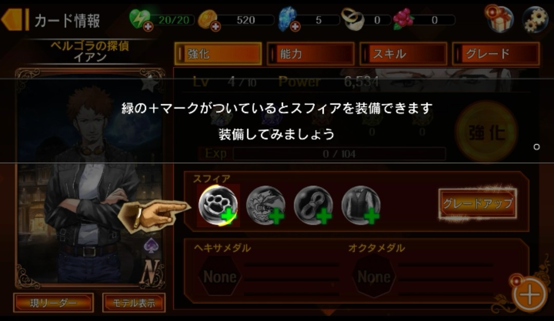 グレードアップには「スフィア」というアイテムが必要になるようです。この「スフィア」、先ほどのクエストで入手したアイテムですね!グレードアップするには、クエストをクリアして指定された「スフィア」を集める必要があるようです。「緑の+マーク」が付いているとスフィアを装備できる(スフィアを所持済みということですね)ので、「緑の+マーク」が付いているところをタップしてスフィアを装備します。
