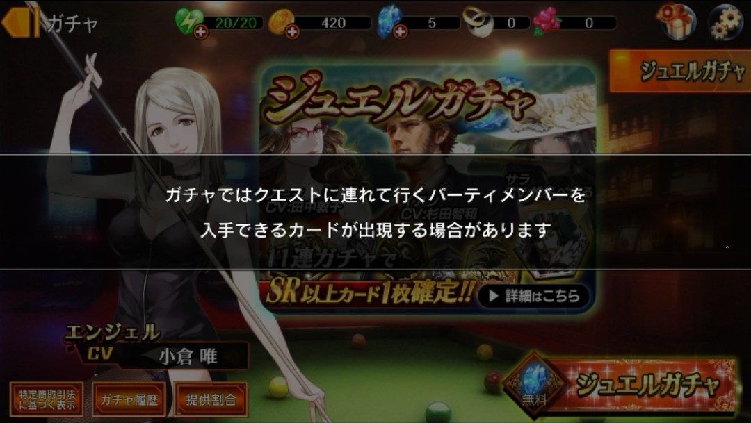 チュートリアルの最後に、ガチャを無料で引けるようです。新しい仲間を入手できるチャンスですね!さっそく、ガチャをしてみます。