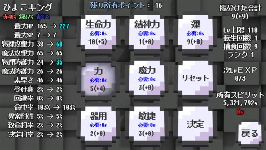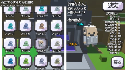 敵を倒すと経験値がたまりずさもんはレベルアップします。そのときにステータスポイントをもらえるので、好きなステータスに割り振ってください。これにより同じスライムでも違った能力をもったスライムが出来上がり、