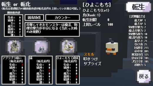 ずさもんのレベルアップできる回数はずさもんによって決まっていて、スライム程度であればすぐに限界に達してしまうことでしょう。そんなときは転生を使って一から成長をさせなおしてください。