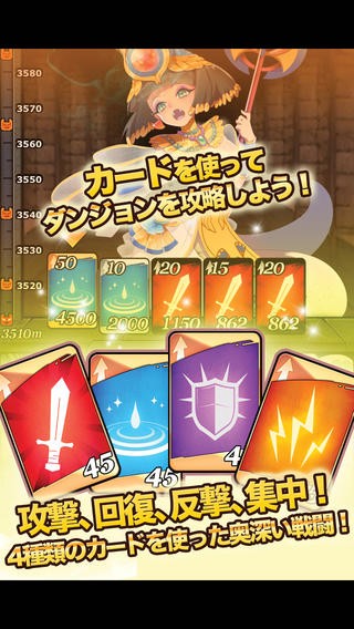 ダンジョンの探索にいざ挑むわけですが、こちらも少し特殊。画面左にはダンジョンの距離ゲージが縦に伸びています。その間にはモンスターや宝箱のマークが散財されており、ダンジョンの進行はカードを使って行うのです。
