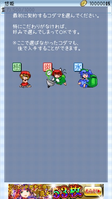 どうにも横道に逸れてしまいます。いけませんね…ではでは気を取り直して先に進んでいきましょう。突然3つのキャラクターから1体を選択することに。属性が3種類。樹、炎、水。まあ好きなキャラを選択して問題ないでしょう。水属性のにとりを選びます!ちびにとりって名前なんですね。確かに小さいけど。