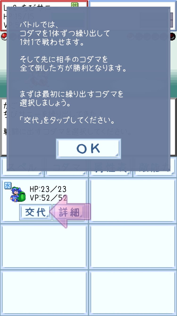 バトルの説明が入り、コダマを1体ずつ出し、相手のコダマをすべて倒した方が勝利と。ふむふむ、殲滅戦ですね。にとりしかいないからにとりを出します。