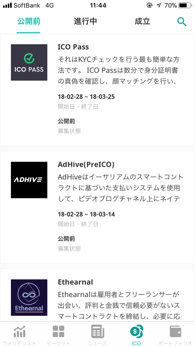 「コイン相場」はチャートやグラフ機能が充実しており、とても使いやすくユーザー評価の高いアプリですが、ICO情報が豊富なことでも定評があります。