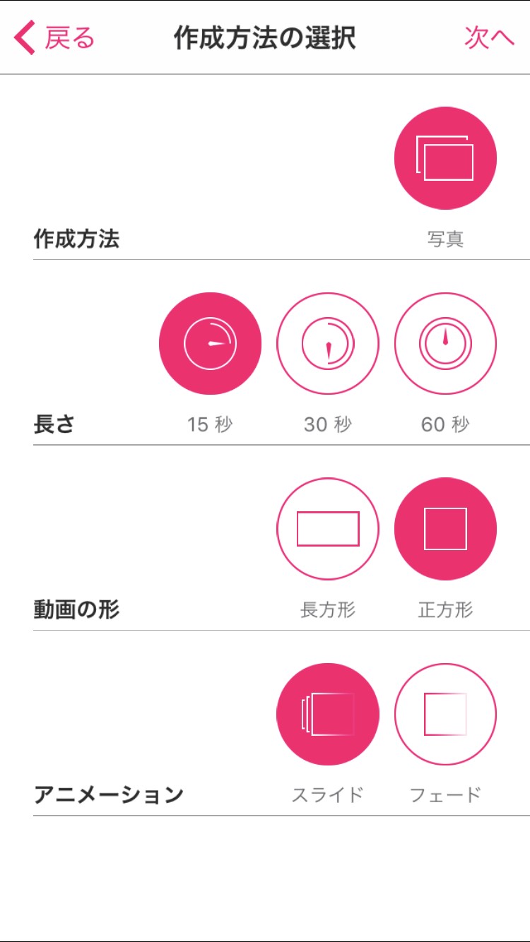 動画の長さを15秒・30秒・60秒と3種類から選べるのはけっこう嬉しいポイント。