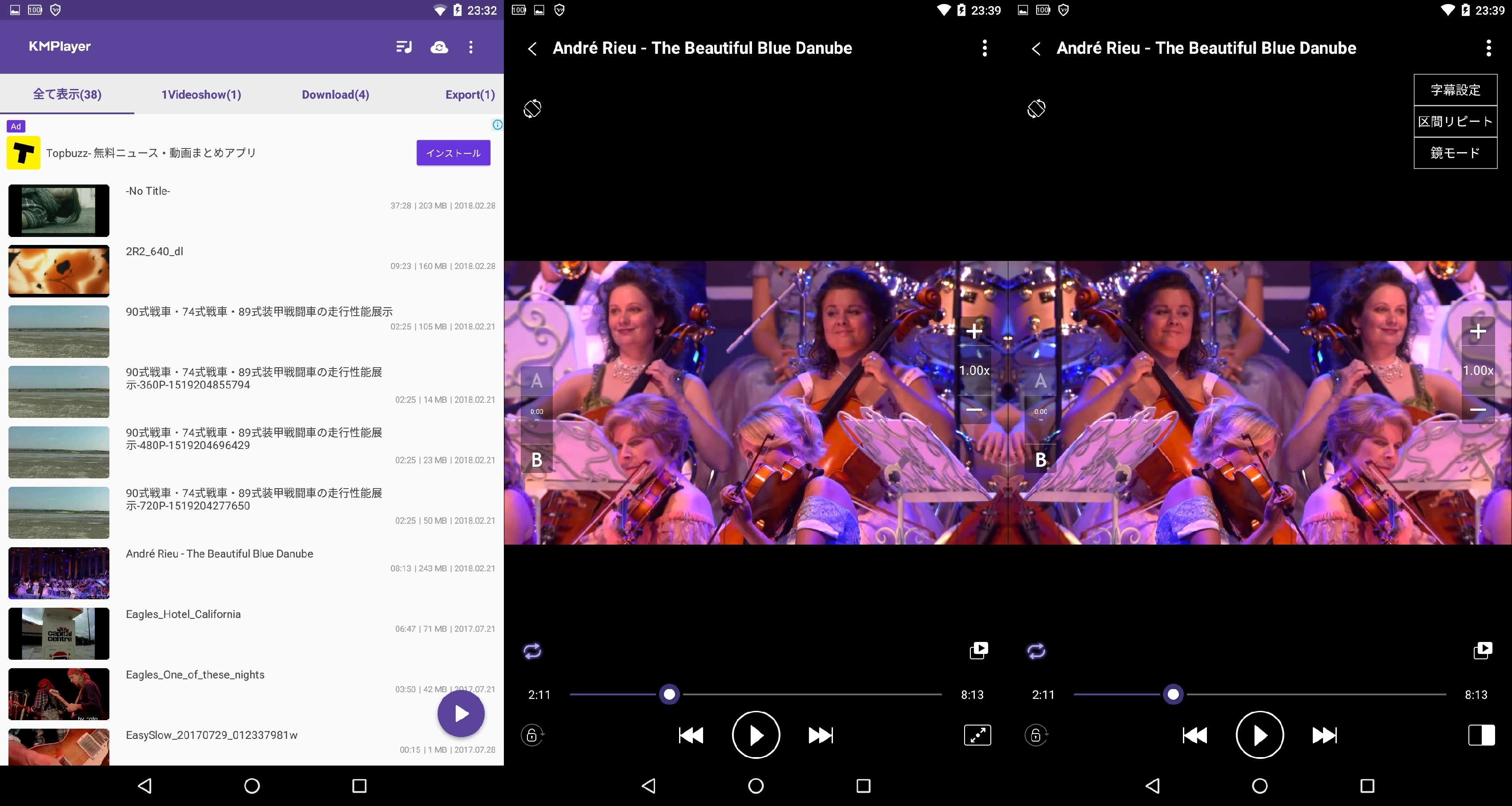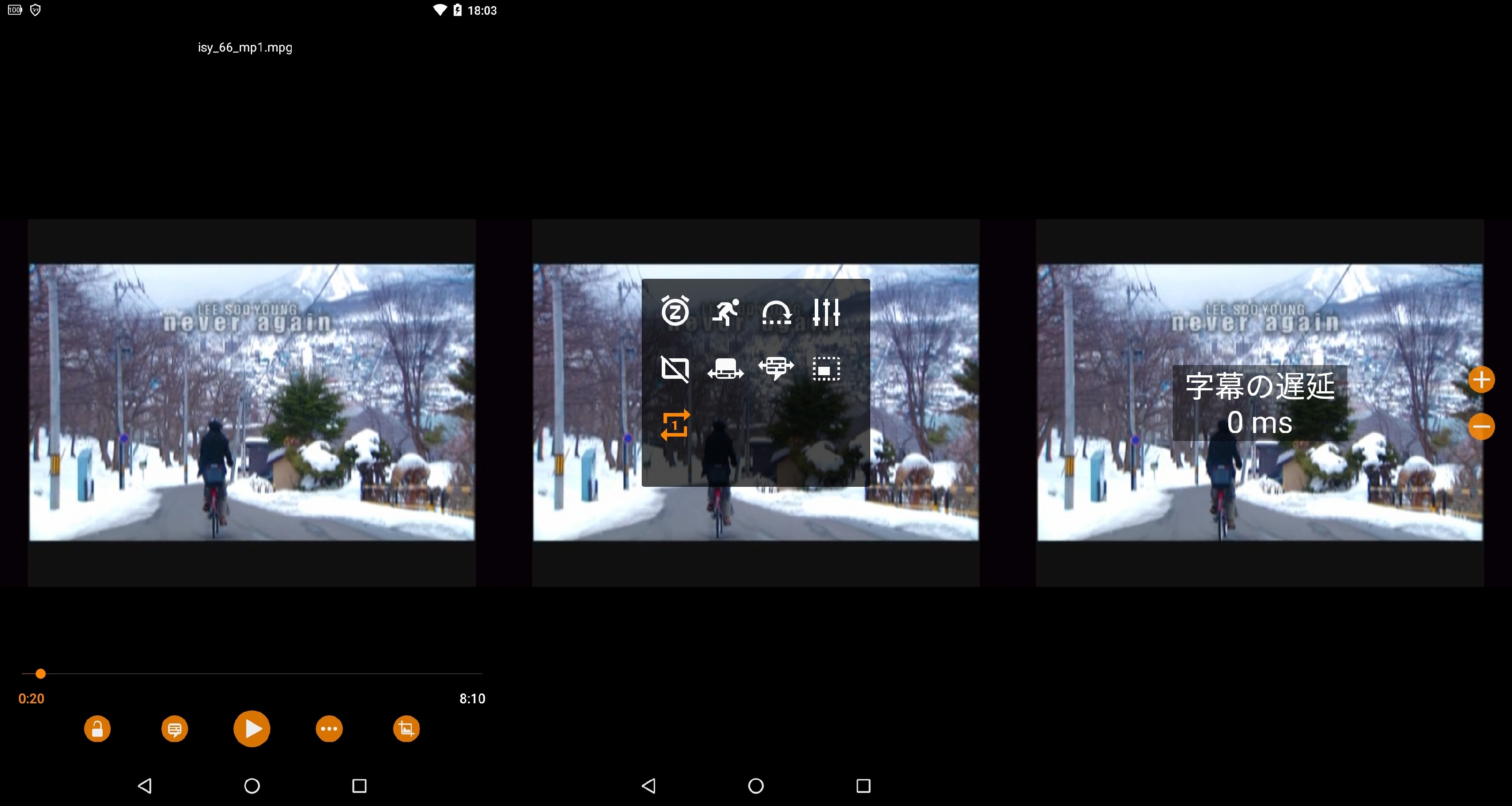 動画の再生機能として、早送り・巻き戻し・速度変更・リピート・ジャンプ・アスペクト比変更などの他、映像と音・字幕のずれを調整、イコライザ、スリープタイマーなどがあります。