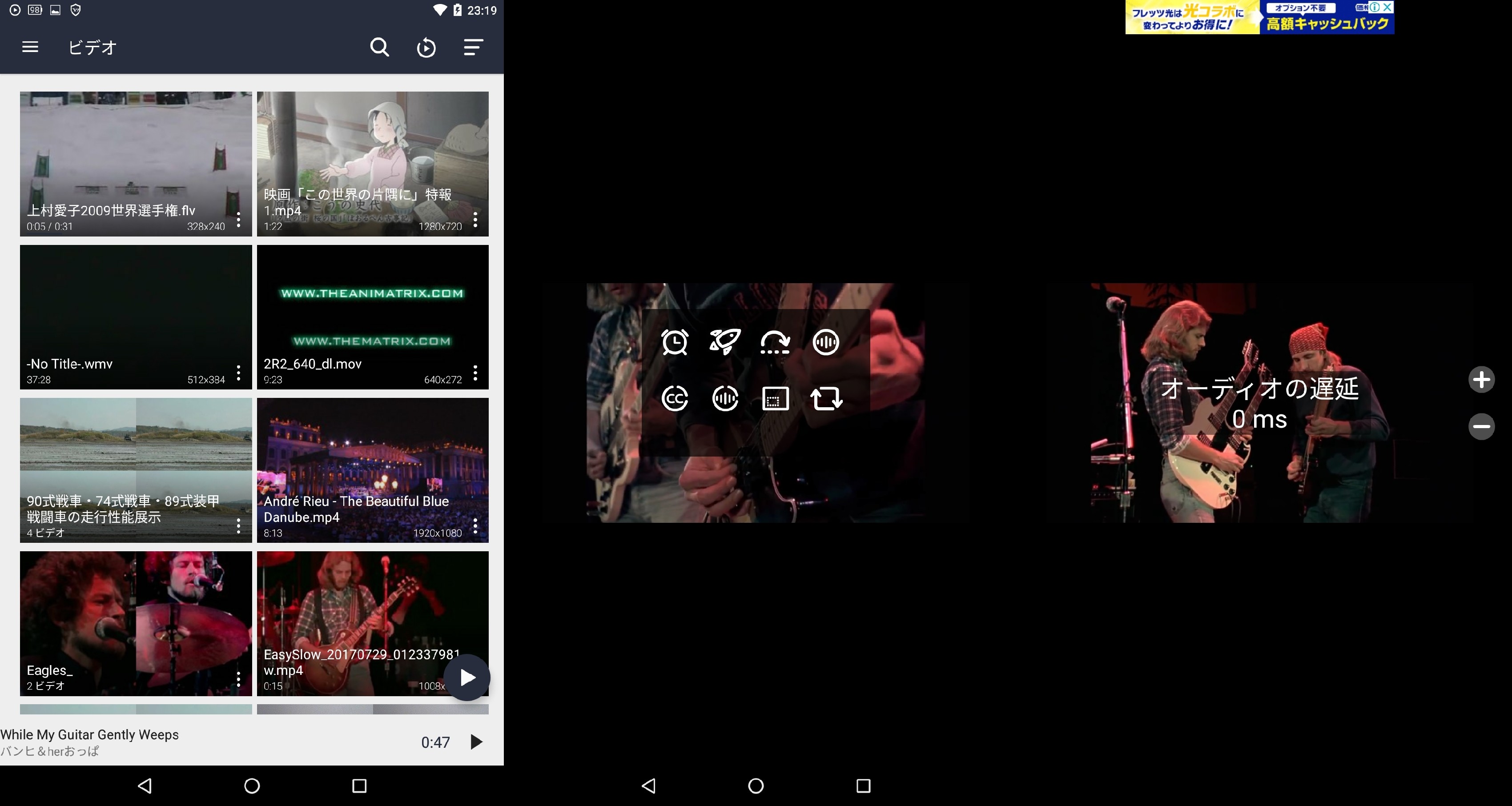 基本的な再生機能はVLC for Mobileとほとんど同じで、サブメニューも日本語表記なのでわかりやすく、マルチメディアプレイヤーが初めての人にもお勧めできるアプリです。