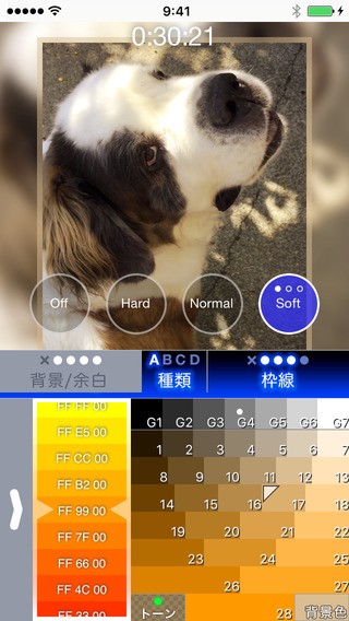 ②余白部分のぼかしの有無を選択します。『Off』はぼかしなし、『Hard』『Normal』『Soft』でぼかしの度合いを選びます。
