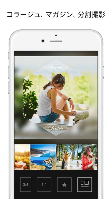 撮影・加工した複数の写真を、一枚の画像にコラージュすることや、マガジン風なお洒落な一枚の画像にまとめることができます。