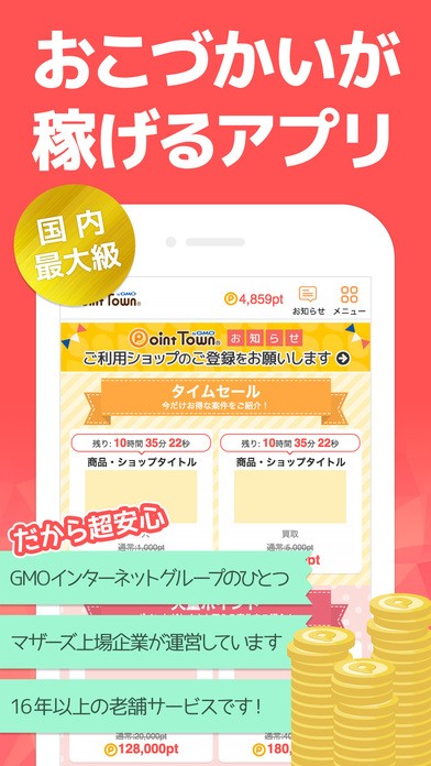 お小遣いを稼げるというのはかなり魅力的ですが、安心して利用できるアプリでないと危険ですよね。そこで、実績もあり信頼できるお小遣い神アプリ、『ポイントタウン』をオススメします!